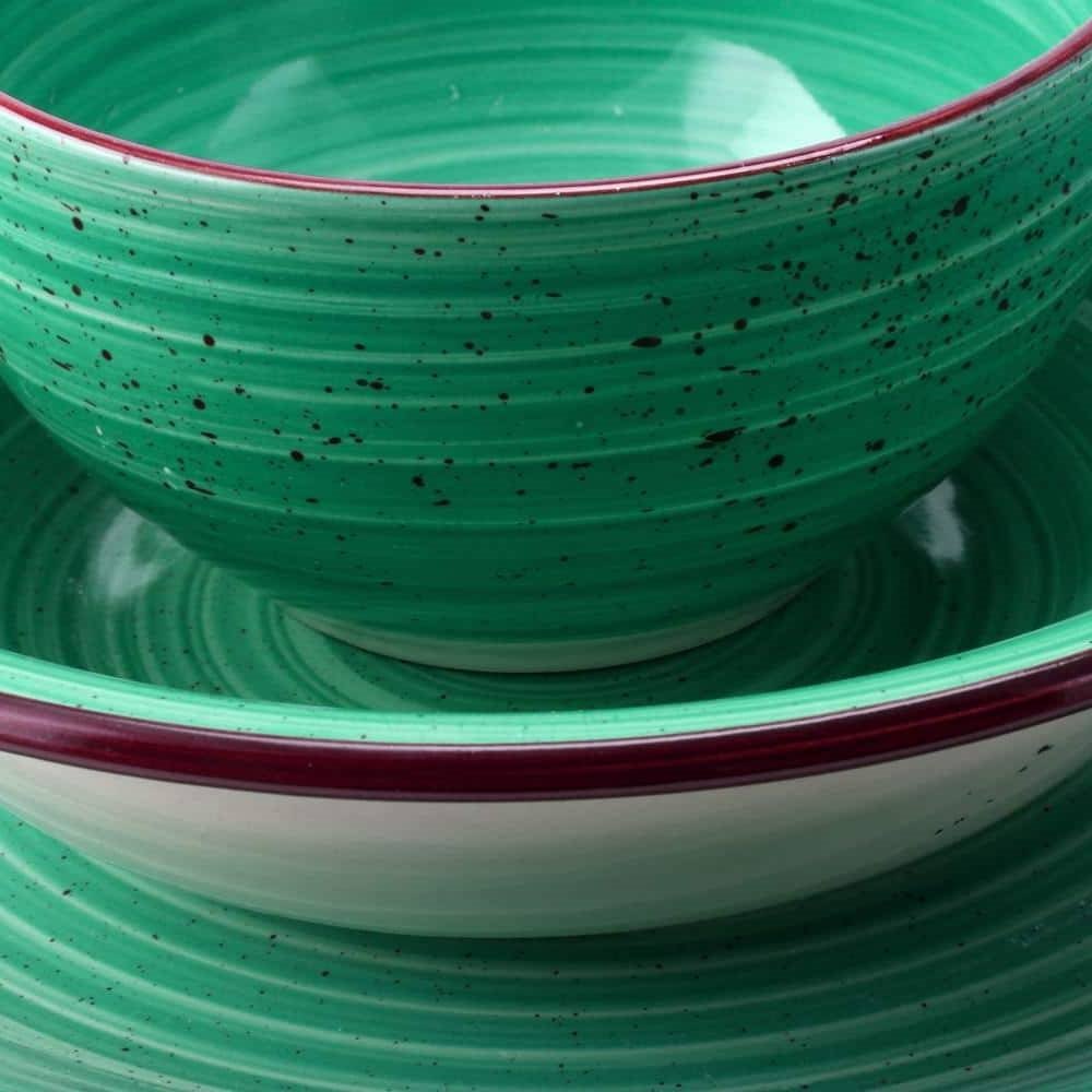 This beautiful 12-piece dinnerware set features 4-assorted colors - red, blue, green, and yellow. Unique speckled finish that brings style to any table. This versatile dish set comes with two sets of bowls so you can serve nearly any type of dish in them. All items are made of durable stoneware. This plate and bowl set features service for four.
