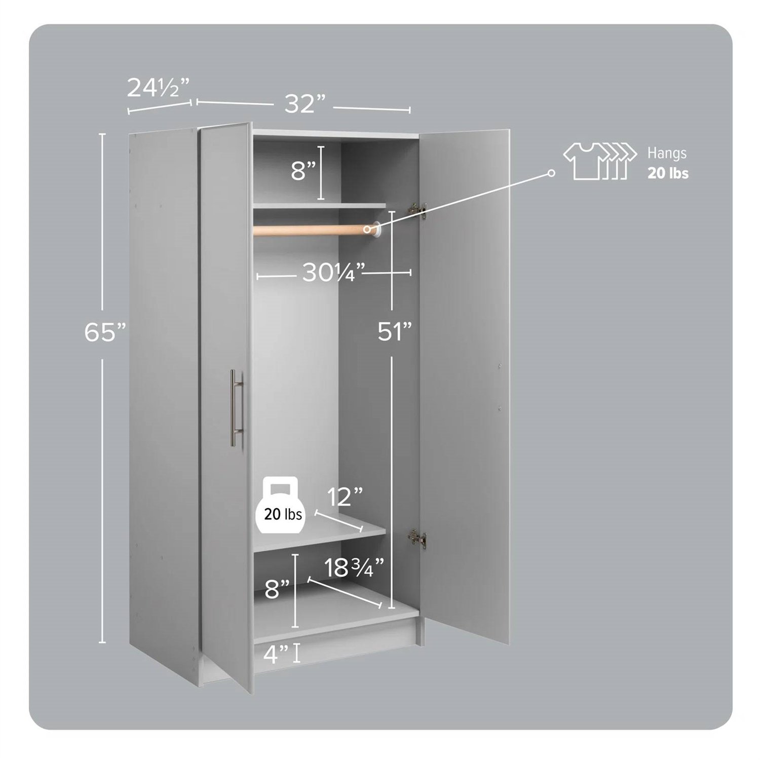 • Ample Storage Space: Description The Wardrobe Closet offers you a wall cabinet and clothes organizer all in one. Designed as a free-standing pantry, this white closet offers a significant internal storage capacity of 18.75" D x 30.25" W x 59" H.