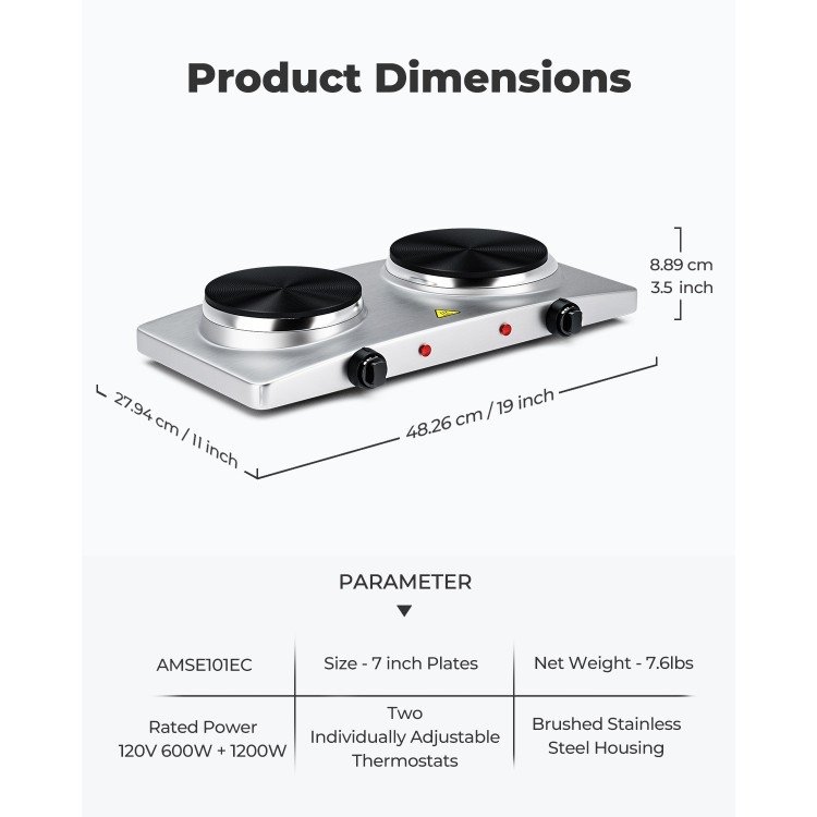 This Dual Heating Infrared Portable Electric Countertop Burner has 2 heating plates that work separately with each electric power of 1200W and 600W. Offers 5 levels of temperature control to easily meet any cooking needs. Turn on/off by simple turning of the knob/s. Also, comes equipped with a thermostat, when it reaches the set temperature, it will automatically cycle on/off the power to maintain the set temperature, preventing overheating. 2 heating plates are sized 7.4'' and 6.1'' diameters for all sizes of cookware. Easy to clean and can go anywhere!