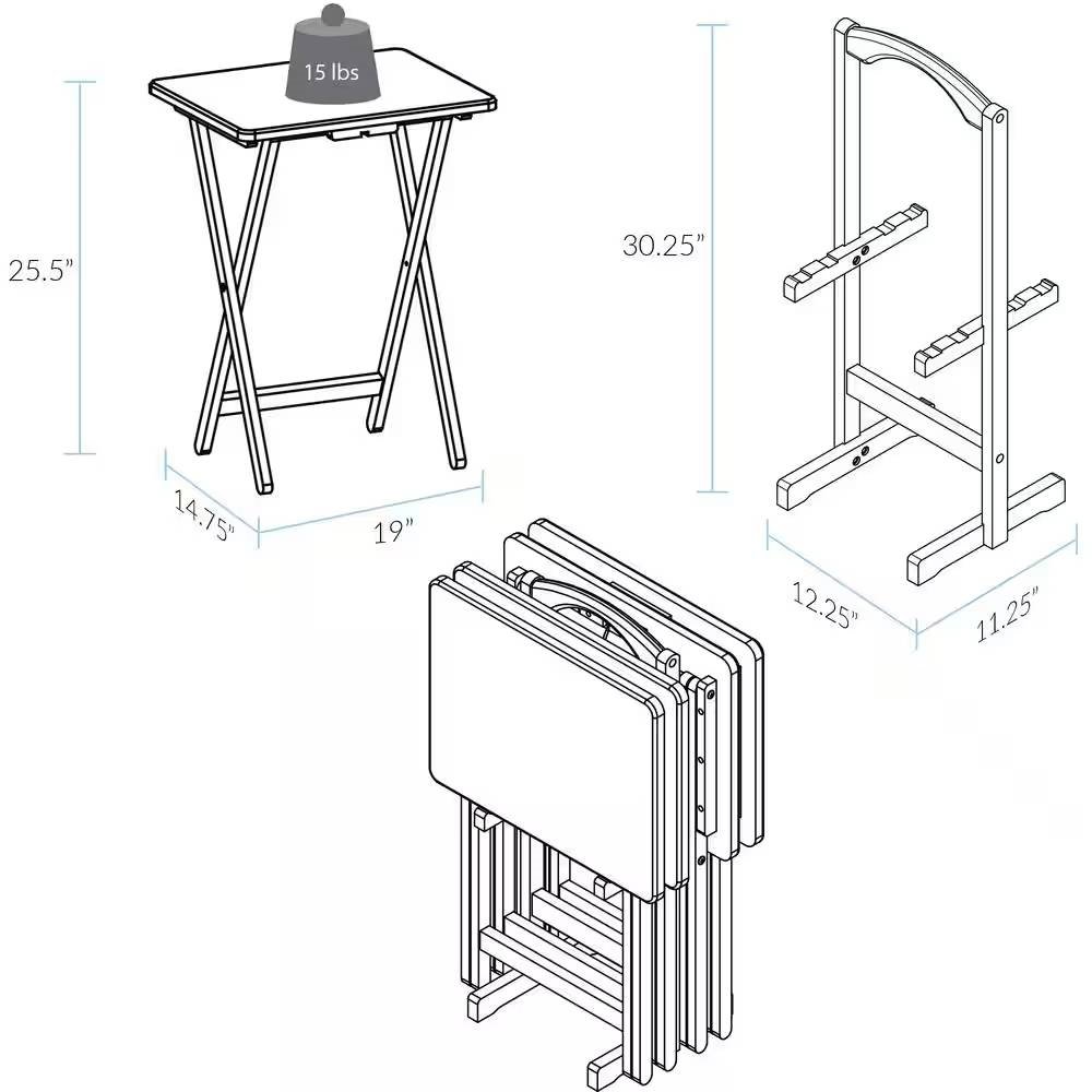 With this Set of 4 - Folding TV Tray Table Set with Stand in Dark Brown Wood Finish you can have a table anywhere in your home. Made of 100-percent solid wood, this set includes 4 folding tables and a convenient storage stand, which is great for transportation. Perfect for TV meals or family meals that make their way out of the kitchen or dining room.